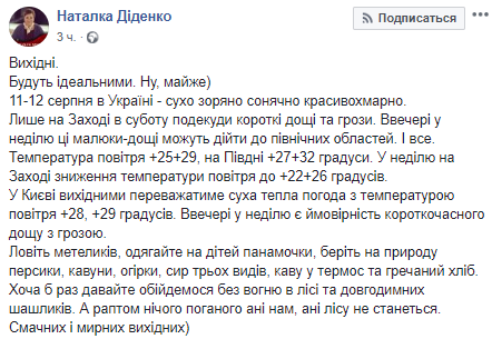 "11-12 августа в Украине - сухо звездно солнечно, красиво и облачно. Только на Западе в субботу местами короткие дожди и грозы. Вечером в воскресенье эти малыши-дожди могут прийти в северные области. И все. Температура воздуха +25 + 29 на юге + 27 + 32 градуса. В воскресенье на Западе понижение температуры воздуха до + 22 + 26 градусов. В Киеве в выходные будет преобладать сухая теплая погода с температурой воздуха +28, +29 градусов. Вечером в воскресенье есть вероятность кратковременного дождя с грозой", - пишет синоптик.