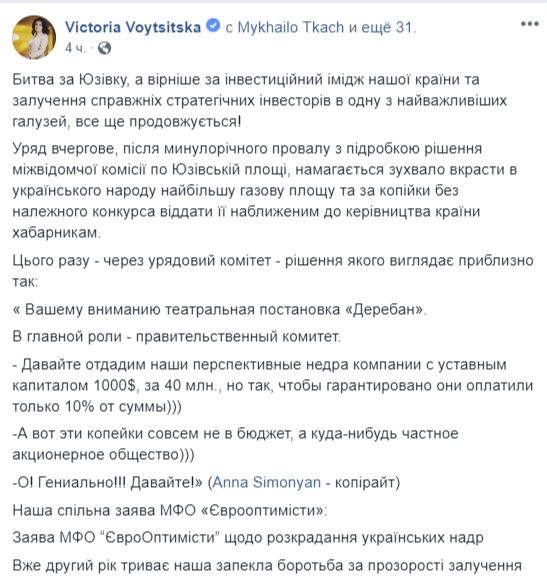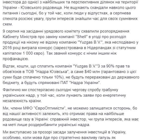"Правительство в очередной раз, после прошлогоднего провала с подделкой решения межведомственной комиссии по Юзовской площади, пытается дерзко украсть у украинского народа крупнейшую газовую площадь … 9 августа на заседании правительственного комитета одобрили распоряжение Кабинета министров по замене компании Shell в СРП на, никому не известную компанию, Yuzgas", - написала она в Facebook.