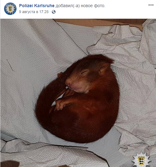 В немецком городе Карлсруэ мужчина позвонил в полицию и попросил помощи из-за слишком надоедливого бельчонка, который все время ходит за ним. Когда сотрудники полиции приехали к нему домой, они нашли спокойно уснувшее животное.