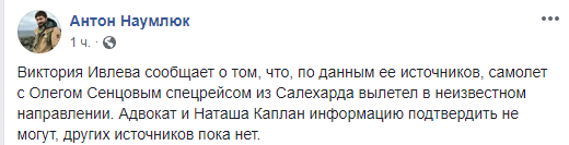 Специальный корреспондент российской "Новой газеты" Антон Наумлюк пишет, что адвокат и сестра Олега Сенцова информацию подтвердить не могут: "Виктория Ивлева сообщает о том, что, по данным ее источников, самолет с Олегом Сенцовым спецрейсом из Салехарда вылетел в неизвестном направлении. Адвокат и Наташа Каплан информацию подтвердить не могут, других источников пока нет".
