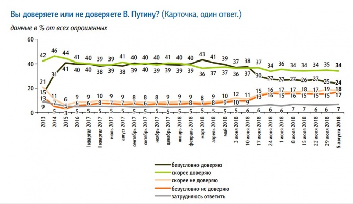 На вопрос "Вы доверяете или не доверяете В. Путину?" вариант ответа "безусловно доверяю" в августе выбрало только 24% опрошенных, тогда как в марте этого года таких было 43%.
