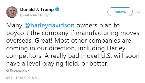 "Многие владельцы Harley Davidson планируют объявить бойкот компании, если она перенесет производство за рубеж. Здорово! Большинство других компаний движутся в нашем направлении, включая конкурентов Harley. Очень плохой шаг! Скоро в США будут равные или даже лучшие условия", – написал Трамп.
