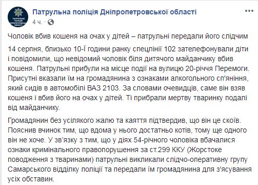 Возле детской площадке в Днепре пьяный мужчина убил котенка прямо на глазах у детей. Об этом сообщили в пресс-службе полиции Днепропетровской области на своей странице в Facebook.