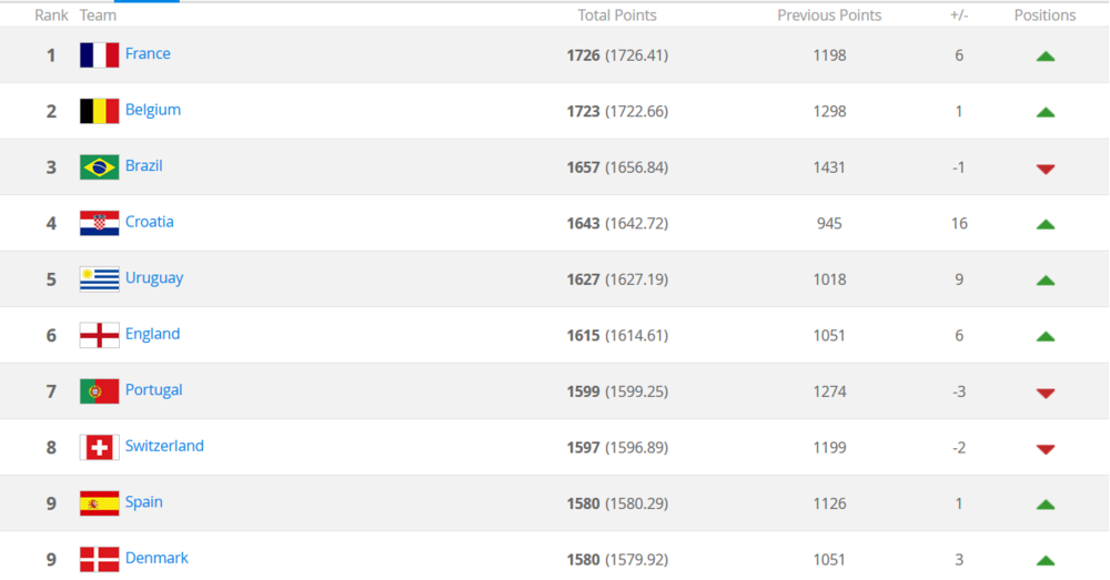 Возглавили рейтинг новые чемпионы мира, сборная Франция. Их соперники в финале Мундиаля, сборная Хорватии, поднялись на 16 позиций и занимают 4 место.