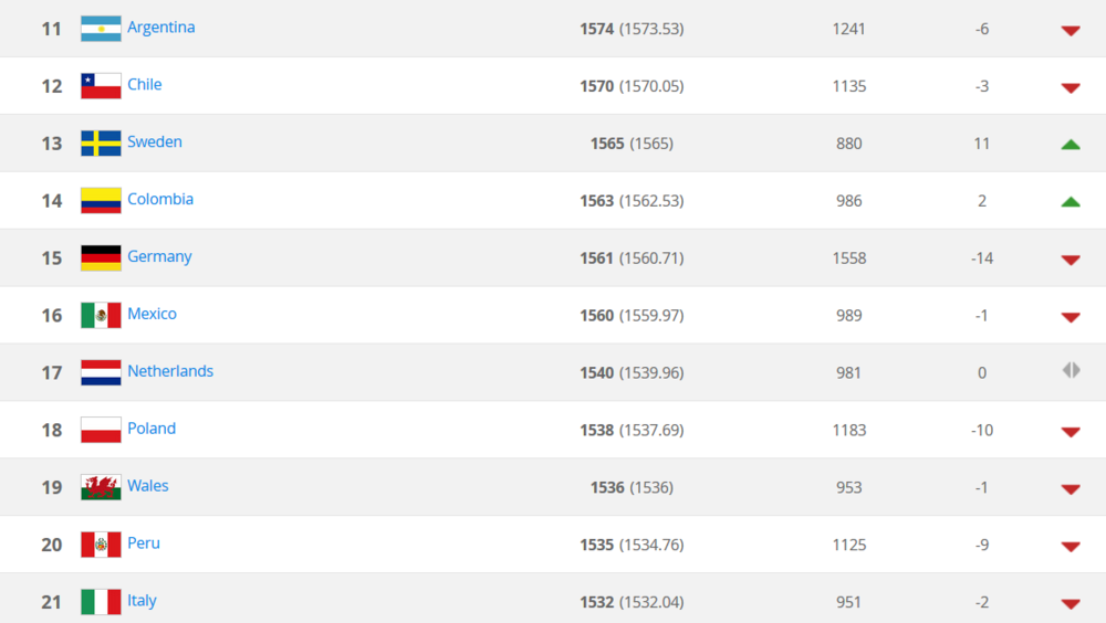 А вот неудачники чемпионата мира, сборная Германии, рухнула на 15 место.
