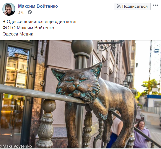 На этот раз скульптура усатого зверя (уже восьмая по счету) появилась на здании на высотке перекрестка улицы Осиповой и Большой Арнаутской. Об этом сообщает фотокорреспондент Максим Войтенко на своей странице в Facebook.