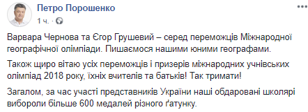 В общем, за время участия представителей Украины наши одаренные школьники завоевали более 600 медалей различного достоинства", - говорится на странице президента.