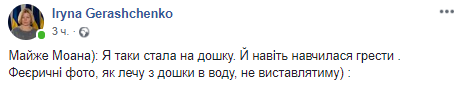 "Я таки стала на доску. И даже научилась грести. Фееричные фото, как лечу с доски в воду, не буду выставлять", - написала в соцсети Ирина Геращенко.