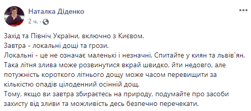 "В западных областях пройдут кратковременные дожди и грозы. Кто в Карпатах - берите с собой дождевики, они пригодятся. Температура воздуха будет комфортной, + 23 + 27 градусов", - предупреждает синоптик Наталья Диденко.