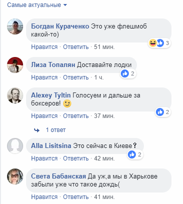 В комментариях пользователи вспомнили мэра столицы Виталия Кличко и объявили флешмоб, некоторые призвали доставать лодки. Также жители Киева призывают властей вспомнить про ливневки и не закатывать стоки в асфальт во время ремонта.