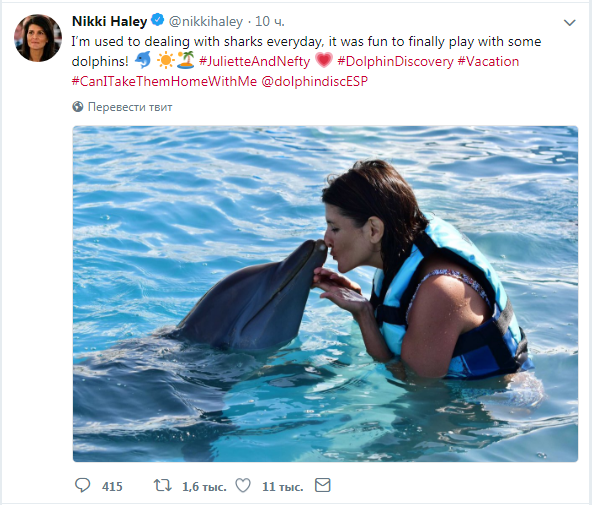 Постпред США при ООН Никки Хейли показала фото с дельфином и намекнула, что "обычно имеет дело с акулами"