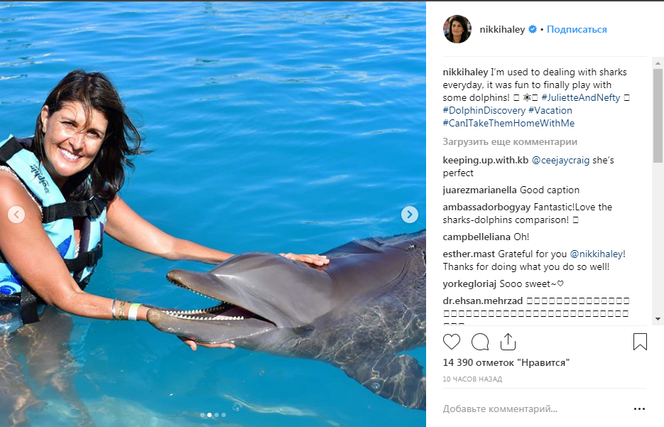В частности, Никки Хейли выложила серию фотографий с отдыха и отметила, что ей, как человеку, который "имеет дело с акулами ежедневно, было весело наконец поиграть с дельфинами".