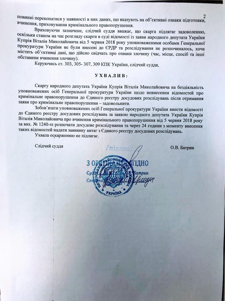 "14 августа суд постановил определение, которым обязал Генеральную прокуратуру расследовать преступления Президента Порошенко, начальника Генштаба Муженко, экс-Министра обороны Гелетея, экс – командующего сектора "Д" генерал – лейтенанта Литвина и Главного военного прокурора Матиоса, предусмотренных рядом статей Уголовного Кодекса Украины, в том числе по госизмене", - сообщил он.