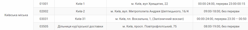 В Киеве 24 августа будут работать четыре отделения Укрпочты: Главопчтамт (ул. Крещатик, 22), отделение на главном железнодорожном вокзале (пл. Вокзальная, 1), отделение возле станции метро Левобережная (ул. Андрея Шептицкого 16/4) и отделение возле международного аэропорта "Киев" (проспект Воздухофлотский, 75).
