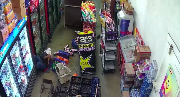Преступник пошел на кражу ночью, когда в магазине никого не было. Камера видеонаблюдения сняла, как ящики с прохладительными напитками упали на пол, и из небольшого отверстия под ними появился мужчина в белой маске.