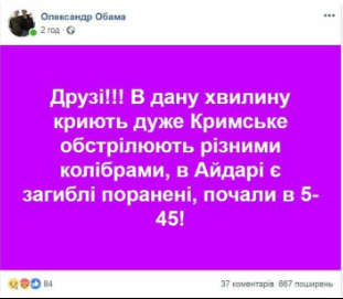 Активист Майдана из Житомира, который в Facebook обозначен как Олександр Обама, еще раньше, чем штаб ООС, рассказал со ссылкой на побратимов из АТО, что основные потери несет батальон "Айдар".