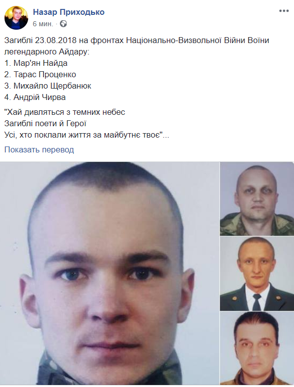 Позже волонтер Назар Приходько назвал имена четырех айдаровцев, которые погибли 23 августа. Это Марьян Найда, Тарас Проценко, Михаил Щербанюк и Андрей Чирва.