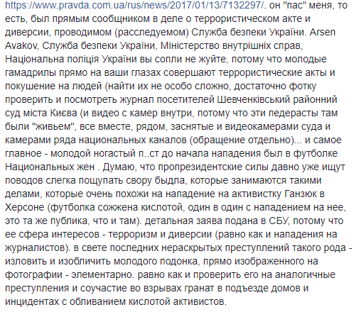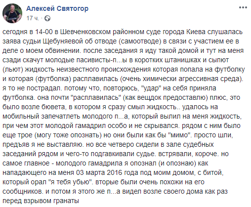 "После заседания я иду такой домой, и тут на меня сзади скачут молодые пасивисты-п...ы в коротких штанишках и сыплют (льют) жидкость неизвестного происхождения, которая попала на футболку, и которая (футболка) расплавилась (очень химически агрессивная среда). Я-то не пострадал. Потому что, повторюсь, "удар" на себя приняла футболка. Она почти "расплавилась" (как вещдок предоставлю) плюс, это было возле бювета, в котором я сразу смыл жидкость", - написал он.