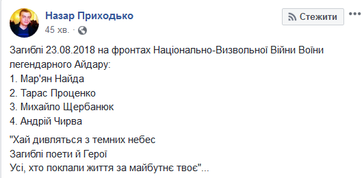 Как сообщает волонтер Назар Приходько на своей странице в Facebook, четверо погибших служили в батальоне "Айдар". Их имена: