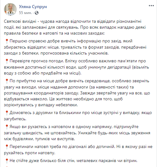 И. о министра здравоохранения Ульяна Супрун в своем Facebook дала рекомендации, как вести себя на массовых мероприятиях в толпе.