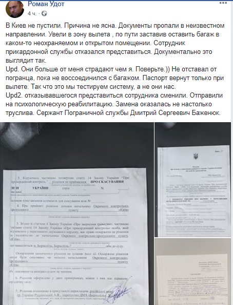 Российский правозащитник Роман Удот хотел посетить Украину, чтобы погулять с друзьями. Его визит должен был занять всего один день. В итоге на территорию страны его не пустили. Об этом он сообщил на своей странице в Facebook.