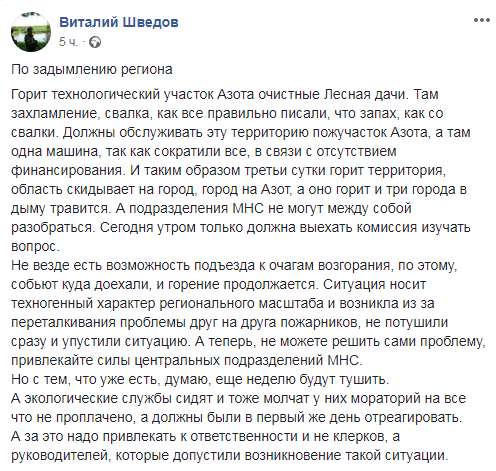 Об этом он написал в Facebook. В заявлении отмечено, что дым и гарь наносят вред здоровью местных жителей.