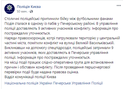 В свою очередь отдел коммуникации полиции г.Киев  сообщает, что инцидент произошел  в одном из пабов в Печерском районе. "Наряды полиции, которые патрулировали территорию в центральной части города, заметили конфликт на ул.Большой Васильковской. Вызвав на помощь спецподразделение, полицейские задержали 9 активных участников, которых доставляют в Печерское управление полиции", - сказано в сообщении.
