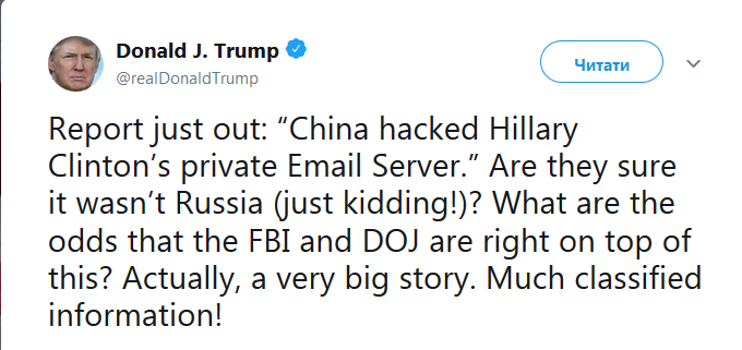 "Просто сообщение: "Китай взломал частный почтовый сервер Хиллари Клинтон". Они уверены, что это не Россия (только шутка)? Каковы шансы, что ФБР и Минюст знали об этом? На самом деле, очень большая история. Много секретной информации!", - написал Трамп.