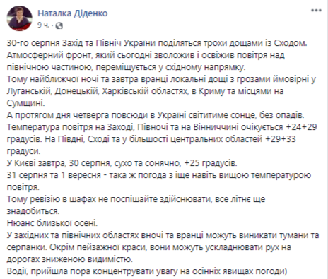 "Ближайшей ночью и завтра утром локальные дожди с грозами вероятны в Луганской, Донецкой, Харьковской областях, в Крыму и местами на Сумщине. А в течение дня четверга повсюду в Украине будет светить солнце, без осадков. Температура воздуха на Западе, Севере и в Винницкой области ожидается + 24 + 29 градусов. На Юге, Востоке и в большинстве центральных областей + 29 + 33 градуса. В Киеве завтра, 30 августа, сухо и солнечно, +25 градусов", -написала она.