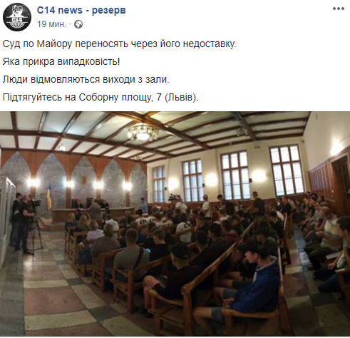 "Суд по Майору переносят из-за его недоставки. Какая досадная случайность! Люди отказываются выходить из зала. Подтягивайтесь на Соборную площадь, 7 (Львов)", - говорится в сообщении.
