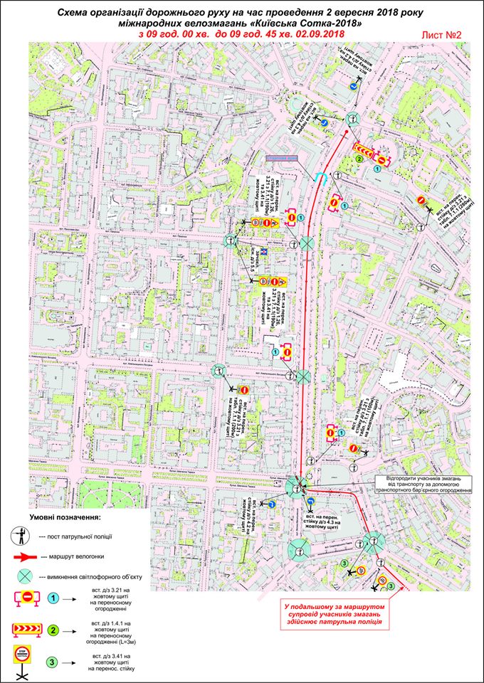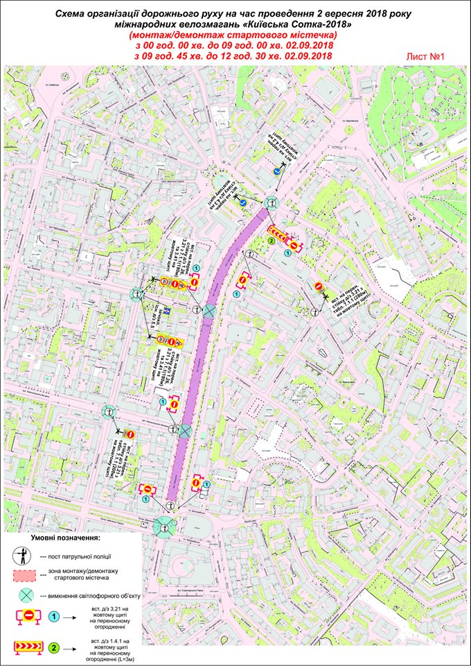 2 сентября 2018 улица Крещатик от Майдана Независимости до Бессарабской площади будет перекрыта с 00:00 до 12:30 - на время монтажа / демонтажа стартового городка и старта соревнований "Киевская сотка". Об этом сообщает Центр организации дорожного движения "Выезд участников велопробега будет осуществляться через улицу Бассейная, дальше перекрытия движения транспорта во время проезда участников будет осуществляться экипажами патрульной полиции. Финиш запланирован в районе Одесской площади около 17:00, предусматривается перекрытие дороги-дублера проспекта Глушкова в сторону центра города", - говорится в сообщении.