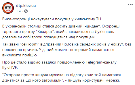 "Охранники нокаутировали покупателя в киевском ТЦ. Так называемые "секьюрити" отправили мужчину средних лет в нокаут, без объяснения причин. В этот момент потерпевший пытается вызвать полицию", – говорится в сообщении.