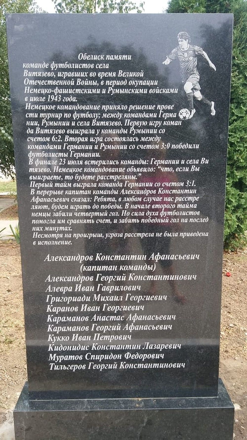 Однако, с памятником произошел прокол. Сначала  на мемориальной плите имена героев матча оказались перепутаны, было  много орфографических ошибок, а факты не соответствовали  действительности. На фото видно, что в тексте, например, нет переносов, большие буквы используются не по правилам.