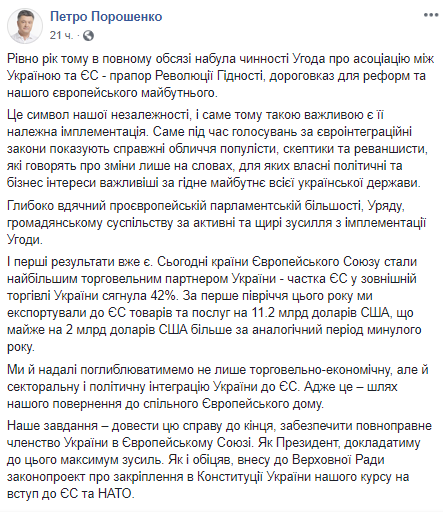 Глава государства отметил, что год назад в полном объеме вступило в силу Соглашение об ассоциации между Украиной и ЕС.