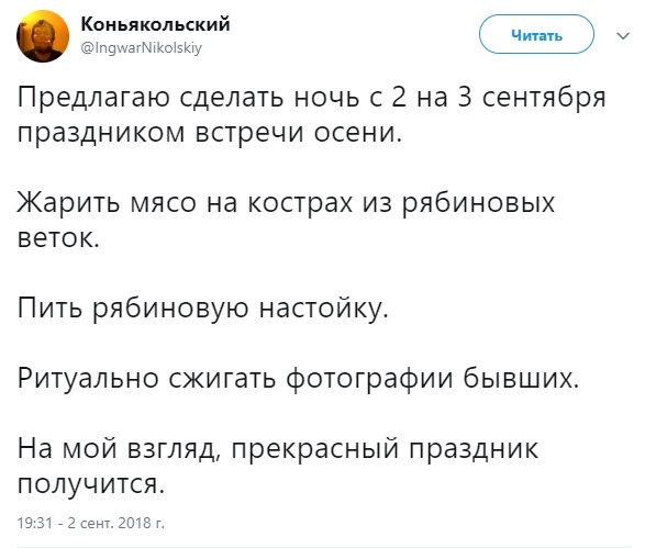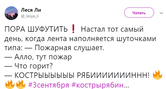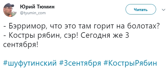 В день 3 сентября сеть взорвалась мемами, связанными с одноименной песней Михаила Шуфутинского. Песня "3 сентября" уже несколько лет является источником для шуток. Пользователи соцсетей массово постят мемы про 3 сентября, "костры рябин" и переворачивание календаря.