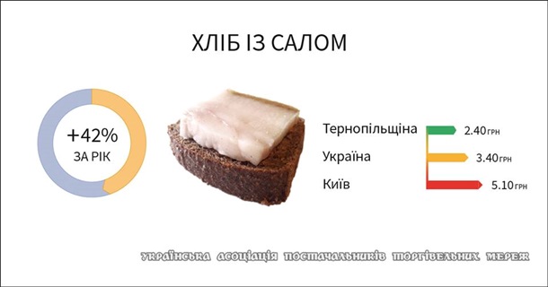 "На сегодня этот вкусный бутерброд нам обойдется в среднем по стране в 3,4 грн. Так, в частности, 40 гр черного хлеба стоит 70 коп, а 40 гр сала - 2,7 грн", - сообщил Дорошенко.