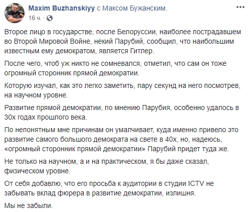 Блогер Макс Бужанский советует спикеру вспомнить дальнейший путь Гитлера: "Второе лицо в государстве, после Белоруссии, наиболее пострадавшем во Второй Мировой Войне, некий Парубий, сообщил, что наибольшим известным ему демократом, является Гитлер.