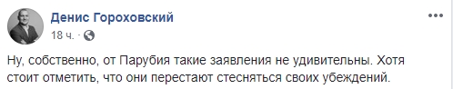 Блогер Денис Гороховский комментирует слова спикера: "Ну, собственно, от Парубия такие заявления не удивительны. Хотя стоит отметить, что они перестают стесняться своих убеждений".