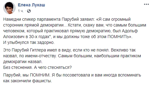 Адвокат Елена Лукаш также предлагает Парубию вспомнить историю: "Намедни спикер парламента Парубий заявил: "Я сам огромный сторонник прямой демократии…Кстати, скажу вам, что самым большим человеком, который практиковал прямую демократию, был Адольф Алоизович в 30-х годах", и мы должны тоже об этом помнить". И улыбнулся так задорно.