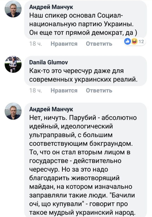 "Он еще тот демократ",  - иронизирует Манчук. "Парубий - абослютно идейный, идеологический ультраправый, с большим соответствующим бэкграундом. То, что он стал вторым лицом в государстве, - действительно чересчур. Но за это надо благодарить животворящий майдан, на котором изначально заправляли такие люди. "Бачили очі, що купували", - говорит про такое мудрый украинский народ", - добавил журналист.