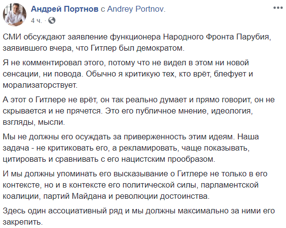 Юрист Андрей Портнов считает, что похвалы Гитлеру от Парубия - маркер идеологии самой партии "Народный фронт", которую представляет спикер.