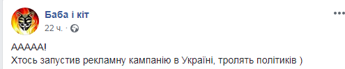 В разных частях города Львова разместили рекламные борды, пародирующие предвыборные маркетинговые кампании украинских политических сил. Их фотографии опубликовало Facebook-сообщество "Баба і кіт".