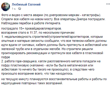 "Сгорели все кабеля на новом мосту. Все операторы Днепра пострадали. Наблюдаем перебои в работе Интернета. пострадало 15+ провайдеров/операторов", - пишет глава компании-провайдера. Также он высказался по поводу причин инцидента.