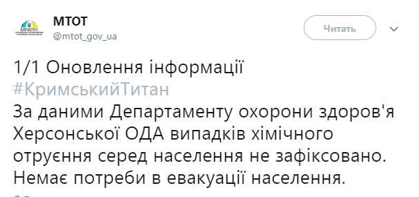 В Херсонской области не зафиксированы случаи химического отравления из-за выбросов химикатов в Крыму. Об этом в Twitter МинВОТ со ссылкой на данные Департамента здравоохранения Херсонской ОГА.