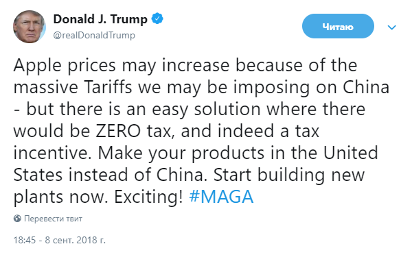 "Цена на продукцию Apple может вырасти из-за огромных пошлин, которыми мы можем обложить Китай - но есть простое решение, в котором были бы нулевые налоги и настоящие налоговые стимулы. Производите свои товары в США, а не в Китае. Блестящее решение!", - написал Трамп.