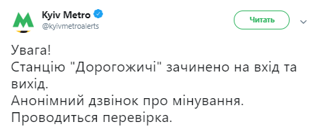 "Внимание! Станция "Дорогожичи" закрыт на вход и выход. Анонимный звонок о минировании. Проводится проверка", - говорится в сообщении.