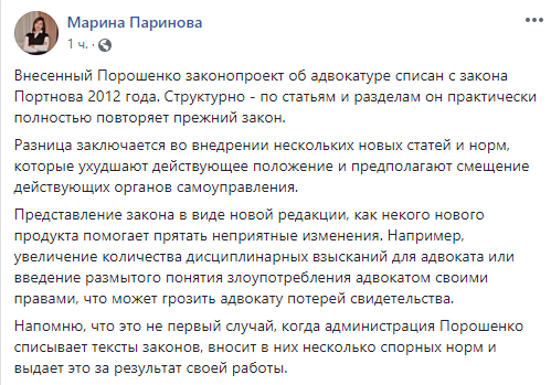 Внесенный Порошенко законопроект об адвокатуре списан с закона юриста Андрея Портнова 2012 года. Структурно - по статьям и разделам он практически полностью повторяет прежний закон. Об этом написала адвокат Марина Паринова на своей странице в Facebook.