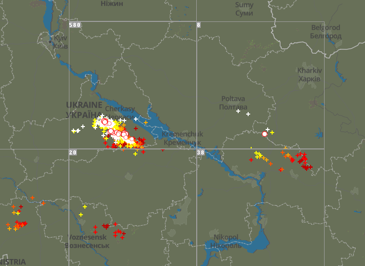 По данным ресурса Blitzortung, который показывает грозовой фронт в реальном времени, сейчас грозы накрыли Черкасскую и частично Полтавскую и Николаевскую области.