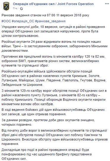 За прошедшие сутки, 10 сентября, ситуация в районе проведения операции Объединенных сил на Донбассе оставалась напряженной. По данным пресс-службы ООС, противник 24 раза открывал огонь по позициям украинских войск. Трижды было применено вооружение, запрещенное минскоми договоренностями. При обстрелах погиб один украинский военный и еще один получил ранения. Об этом сообщается на странице ООС в соцсети.