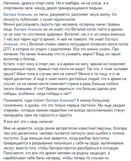 "Еще больше мне не понравилась толпа одобряющих комментариев под такими постами блогера Валера Ананьев. Мол, так ему и надо, дебилу-пострадавшему, так его, наш защитник Ананьев, мало ты ему дал, давай еще. Напомню, драка в спорт-зале. Не в пивбаре, не на улице, а в спортивном зале, между двумя тренирующимися людьми. Валера Ананьев, он легко, разумеется, разгоняет такую волну. Он личность публичная, с кучей подписчиков", - написал блогер.